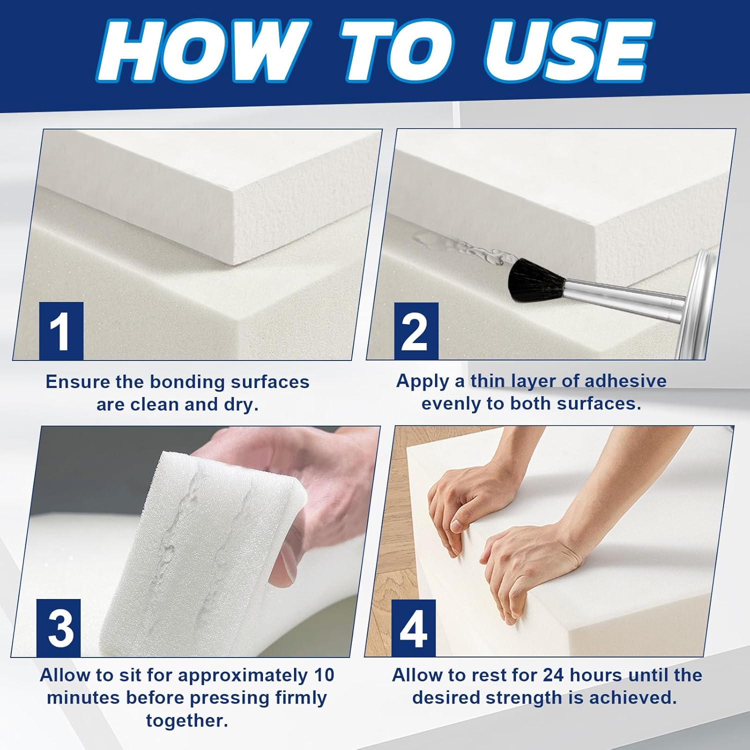 - Easy to Apply: Glue for foam apply by brush, making it easy to control the amount you apply. Once slightly dry, press firmly and allow 24 hours for application.